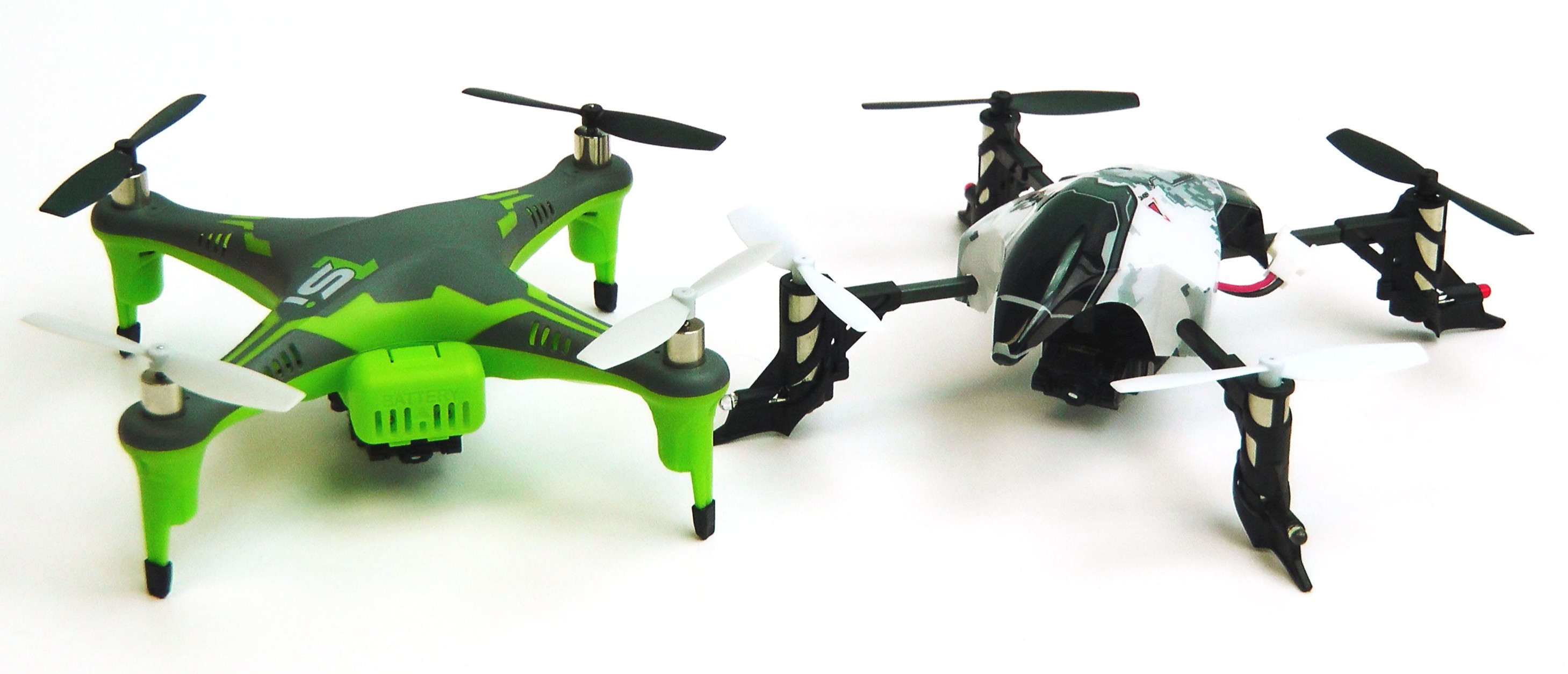 The transmitters which come with the copters have two joysticks on the front, an LCD display for settings as well as a large on/off switch. On the rear there is one button for photo capture and another for video.