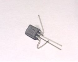 2. Take the 3906 transistor and bend the emitter leg (the one on the far right in the photograph) first perpendicular to the base leg but in the same plane and then over the top of the transistor body. Then take the base leg and bend it perpendicular to the transistor body as shown in the photo.