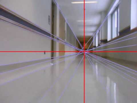 Shown below is a video of a robot that uses the perceived vanishing point of an image to navigate through a corridor. The robot, based on an iRobot Create, uses a standard webcam and video processing to locate the vanishing point of what it sees, and navigates towards that point. Such navigation works very well in office-like environments with straight walls, windows, and ceilings. The robot also uses visual clues, like orange traffic cones, to recognize specific locations.