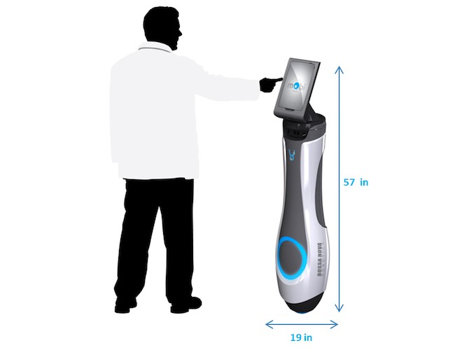 The new "mObi" is certainly not part of Bossa Nova's toy robot lineup, and is the first commercial ballbot intended to be used as a personal robot, a telepresence platform, a guide or more. Its main distinguishing feature is that it balances entirely on a ball, which is the sole contact it has with the ground. The ball is also used for locomotion. This feature makes the robot very agile by reducing its overall footprint and increasing maneuverability, but at the same time condemns it to having to be perpetually balanced (and therefore powered). If you are wondering how it stops, see the video below which describes, among other things, its unique safety legs which allow the robot to stand when powered off.