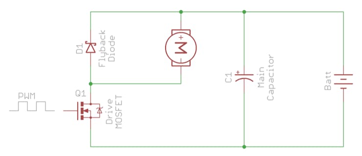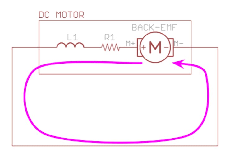 Same thing happens when the MOSFET is turned off, the motor current cannot decrease to 0 immediately. This is where the Flyback Diode D1 comes into play. It provides an alternative path for the motor current to flow when the MOSFET is turned off.