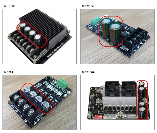Main Capacitors on Cytron's motor drivers