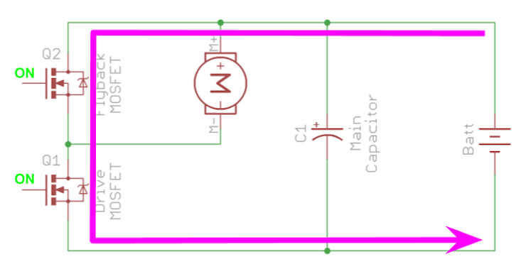 Consider the previous case for dynamic braking where the motor is running and the flyback MOSFET is on, current is flowing through the flyback MOSFET producing torque in opposite direction.
