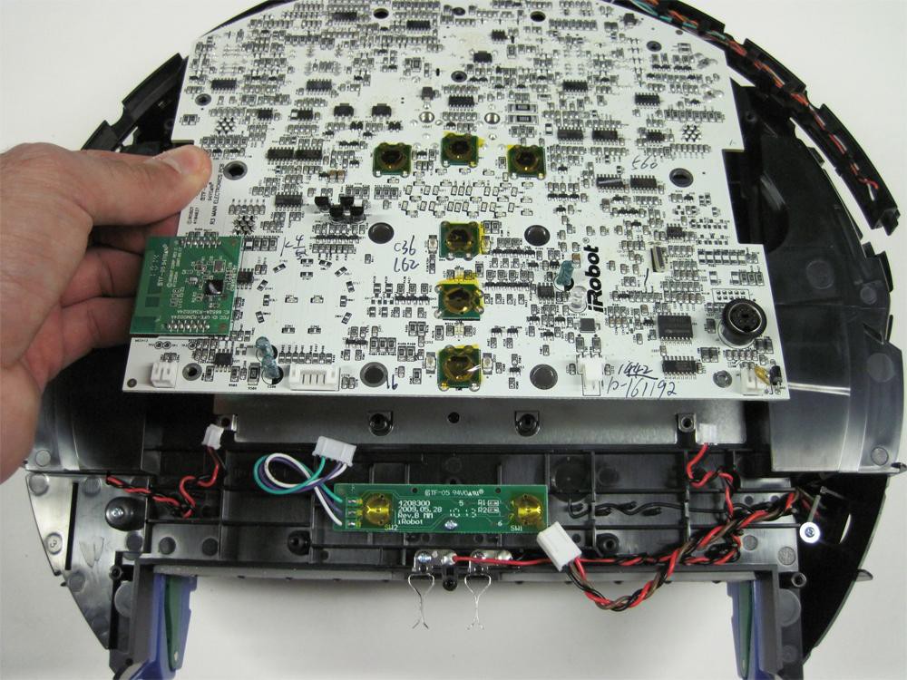 11 How to Replace Roomba’s Motherboard 11.1 How to Remove the Old Motherboard 11.1.1 The Roomba will look like this as first. 11.1.2 Remove the display bezel set. 11.1.3 Notice that the display bezel set has three parts that sit one on top of the other, as shown in the picture. 11.1.4 Loosen the four screws holding the control panel in place. 11.1.5 Remove the control panel from the Roomba. 11.1.6 Remove the transparent plastic insulator layer from on top of the Roomba’s motherboard. 11.1.7 Loosen the five screws holding the motherboard to the Roomba. 11.1.8 Next, unplug the four connectors at the bottom of the motherboard, shown by the arrows at right. 11.1.9 Once the connectors are unplugged, lift the motherboard up from the bottom to loosen it. It will not come out of the Roomba yet, as the top portion must also be disconnected. 11.1.10 Lift the front end of the motherboard up slightly and disconnect all five connectors from the motherboard. 11.1.11 Now remove the motherboard from the Roomba. 11.1.12 View of Roomba with the motherboard removed. 11.2 How to Install the New Motherboard 11.2.1 View of new motherboard to be installed. 11.2.2 Reinstall the motherboard, starting at the bottom. Line up the motherboard with the four bottom connections. 11.2.3 Reconnect the four connectors, as shown by the orange arrows. 11.2.4 Line up the board so that the four holes pictured are aligned with the four corresponding posts on the Roomba’s frame underneath. This will help you with the next step. 11.2.5 Stand the Roomba on end to make connecting the top of the motherboard easier. 11.2.6 Reconnect the five connections shown by the orange arrows. The connections can only go in one place each. 11.2.7 With all the connectors properly connected, push the motherboard down into place. 11.2.8 Place the five motherboard screws in place and tighten them down. Do not use an electric screwdriver as these threads are plastic and particularly delicate. 11.2.9 Place the transparent plastic insulator back over the motherboard. 11.2.10 Place the control panel on the motherboard, careful to line up the four screws with the four threaded posts underneath. 11.2.11 Tighten the control panel’s four screws in place. 11.2.12 Place the first layer of the control panel display as shown in the picture. 11.2.13 Put back the control panel display cover, making sure the orientation is correct. 11.2.14 Place the control panel display trim around the cover, making sure the screw hole is at the bottom. 11.2.15 You now have successfully replaced your Roomba’s motherboard. For details on how to reassemble the Roomba’s frame, please see the Roomba 500 Series Servicing and Repair Guide Chapter 3: How to Open Up Roomba. Roomba replacement parts can be found at RobotShop.
