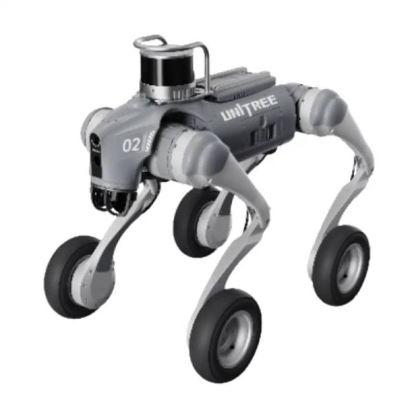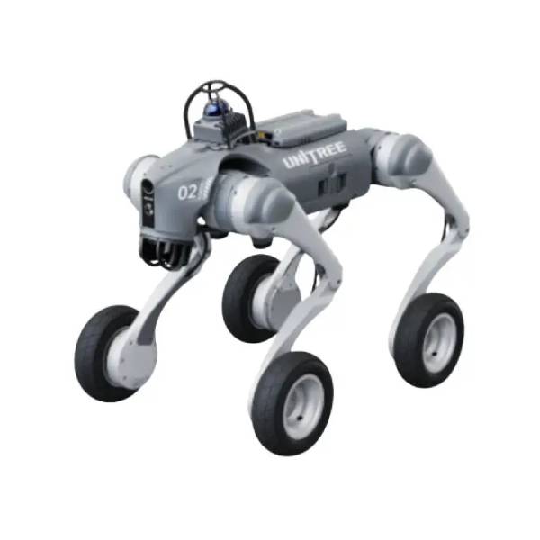 Go2-W keeps the legged platform but adds powered wheels on the feet (7" pneumatic tires). It can roll quickly on smooth ground, then still step over gaps or small obstacles using its legs. Typical top speed is around 2.5 m/s on flat surfaces, with a working payload on the order of several kilograms (often ~8 kg, peak ~12 kg depending on configuration). Variants layer in compute (Jetson Orin), LiDAR, PTZ/thermal, or inspection-focused sensing.