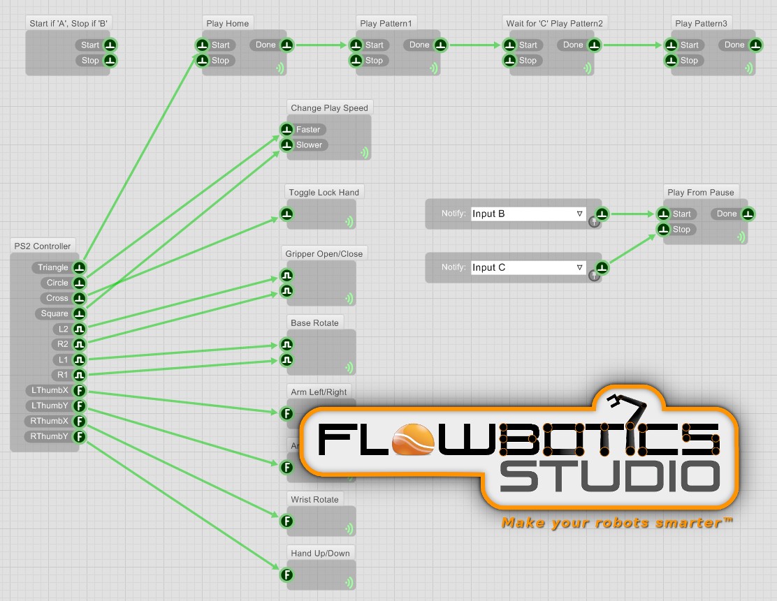 With the latest version of FlowBotics Studio, you get some neat pre-programmed features that allow you to take external control of your robot without creating any code. These largely use the spare input pins (ABCD) on the SSC-32 servo controller to control the software state as well as hardware control from the included wireless PS2 controller. Earlier, we introduced the concept of patterns and sequences allowing you to build a library of robotics movement. Now using the ‘Special Operations’ tools you can add a ‘Pause Before Frame’ command on the timeline to control your robot. This will pause the sequencer at a particular frame until you toggle input ‘B’ on the SSC-32 server controller board which will resume playing. Input ‘B’ can also be used to start playing from anywhere in the sequence. Input ‘C’ will stop the sequence, giving you full control of the timeline transport via external hardware pins. This basic functionality enables you to get multiple robots to interact and can be used to add various sensors to control your robots behaviour.