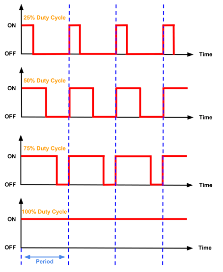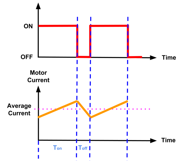 To control the motor speed, we just need to vary the ratio of on and off time (duty cycle). This method is called Pulse Width Modulation (PWM).