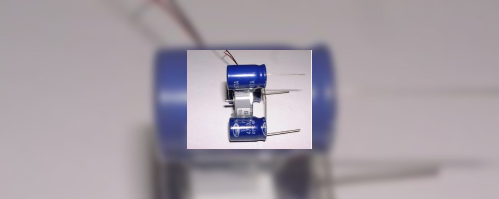 1. Attach the three capacitors to the motor body using a hot glue gun (you can use epoxy-resin but it's easier with hot glue). Apply the glue to the lighter colored stripe on the capacitor body (this stripe identifies the negative lead). Align the capacitors vertically so that the bottom of each capacitor is approximately 4 mm below the bottom face of the motor.
