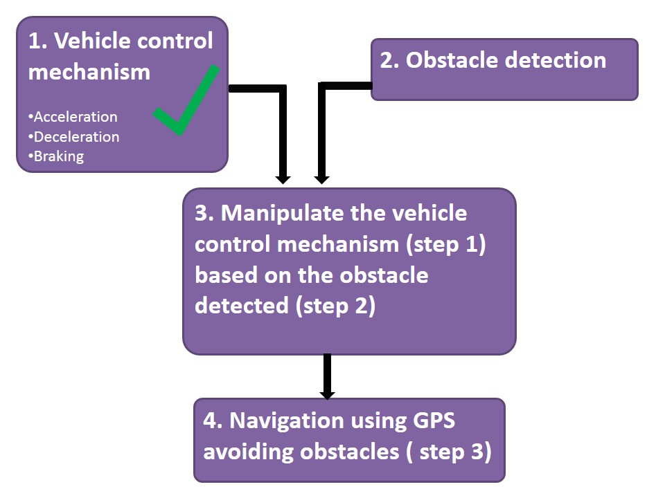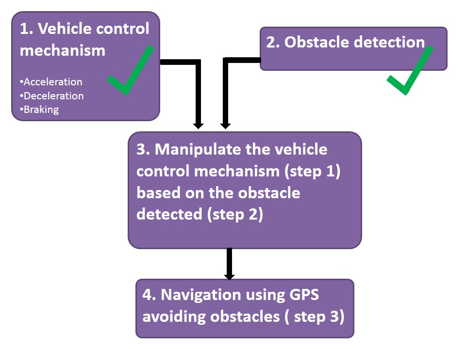 Now, we have a developed an obstacle sensing mechanism and we already know how to control the vehicle manually. Now all we have to do is to combine both the methods.