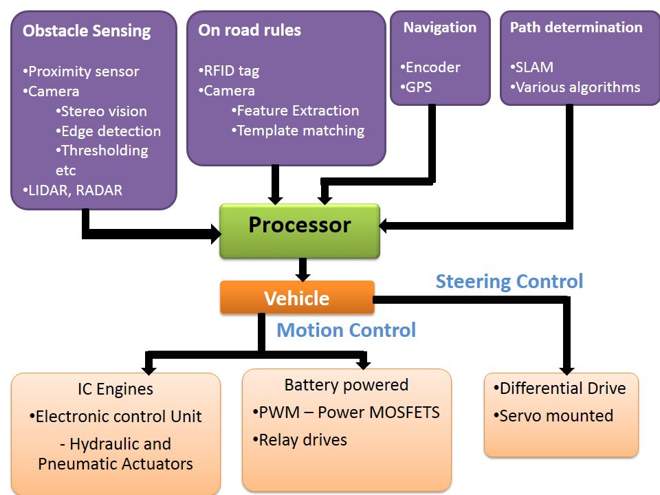 Now lets start to built an Autonomous vehicle. From the above two pictures, it is understood that the designer of an autonomous vehicle must decide how to sense the obstacles around the vehicle, How to move the vehicle from source to destination point while deciding the appropriate path to be taken.