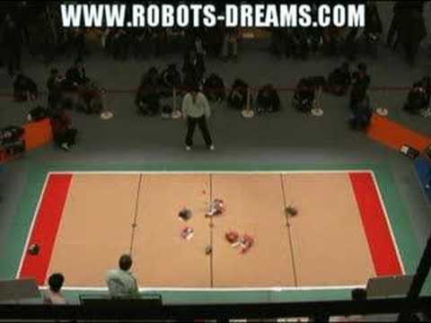 The teams are made up of 4 robot players roughly the size of 3kg sumo-robots. Crazy mayhem ensues. Game play is in 2 3 minute halves.