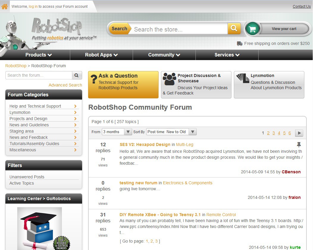 Back in September 2012, RobotShop acquired Lynxmotion, and with it, the popular Lynxmotion forum (www.Lynxmotion.net). The Lynxmotion forum not only included discussions about Lynxmotion products and kits, but also posts and discussions about other people's projects, experiments and ideas. With over 8000 active topics and dozens of users online at any given time, the Lynxmotion forum was one of the most popular places to meet and discuss robotics. Now that both the RobotShop and Lynxmotion forums have been merged, we hope to further expand this community and improve the user experience.