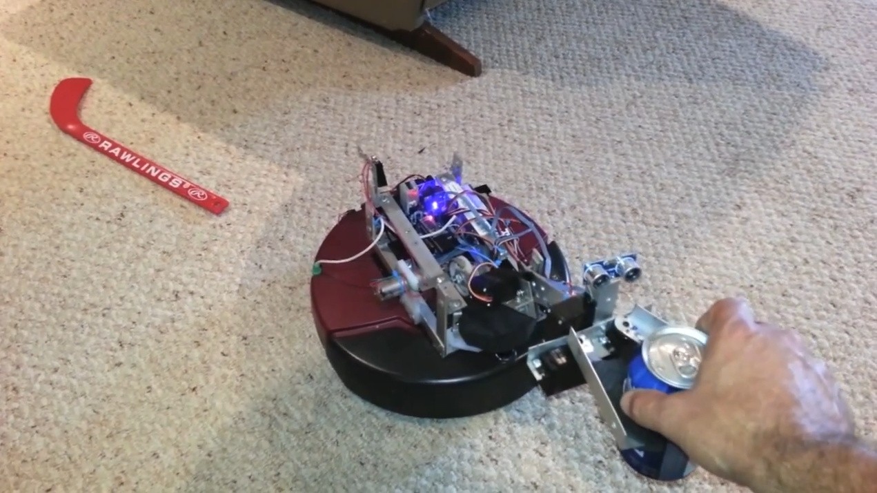 The Brewster robot came to our attention via the RobotShop Forum. User robmcc hacked an older model Roomba, some servo motors, and what looks like a complex and custom-made mechanical rig to fetch and transport a can of beer. Without further delay, here is the robot in action:.'>