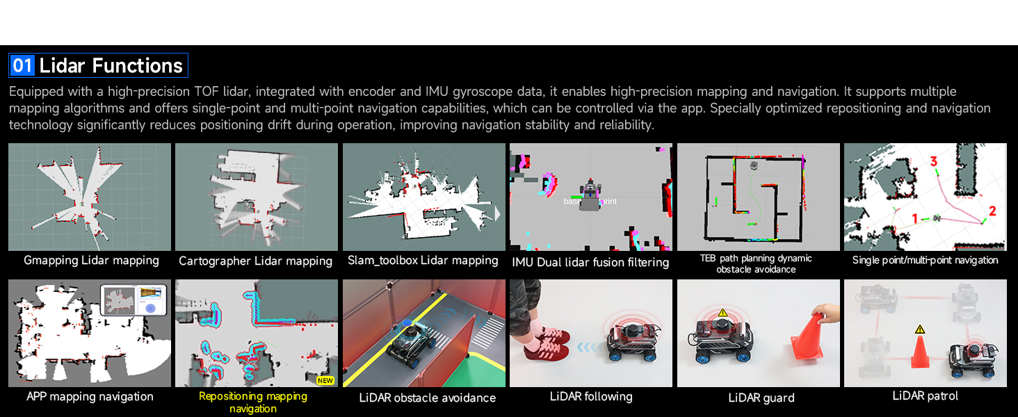 ROSMASTER A1 not only has the real car movement characteristics of the Ackerman chassis, but also deeply integrates three AI models of language, voice, and vision. It supports SLAM mapping, autonomous navigation and semantic understanding. It can also serve as an ideal teaching platform for courses such as autonomous driving principles, path planning, decision-making and control, fully meeting the diverse needs of ROS education and teaching research.
