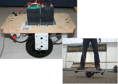 travels by itself like a Segway by adjusting its center of gravity and balancing itself. The direction and the movement are controlled by a hand-held remote control that the skater holds.