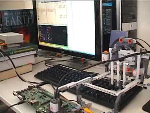Mindstorms parts, a webcam and a computer. A Texas Instruments DSP board (TI DM6437 DSP board) decrypts what happens on the screen and then communicates with the Mindstorms NXT robot through LED lights.
