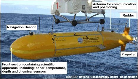 A 5.5m long, 6,100 lb robotic submarine called the Autosub6000 (I wonder if there was a 5000) is getting ready to explore the depths of the Cayman Trough in the Caribbean. The Cayman Trough, which you may remember from the film, The Abyss, has never been explored do to its incredible depths of up to 25,000 ft (the Mariana Trench, by comparison, is 29,000 ft deep). The AUV will be used by the National Oceanography Centre in Southampton (NOCS) on two, month-long, autonomous, exploration trips to plumb the depths of the trough. Autosub6000 will be used to autonomously identify volcanic acvitivty, and mark the location for a ROV, Isis, to take samples. The unique features of the vents are expexted to yield many new species of life.