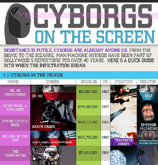 From the same folks that brought us the Wild World of Robots, comes the Cyborgs On The Screen infographic. Full graphic after the jump.