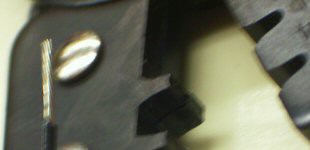 Sorry for the blurry picture, but you can make it out, the pin is sitting in the groove with the 'tabs' facing into the groove. It is placed so that when the crimp too is squeezed the tabs bend inwards and create a "heart" shape.