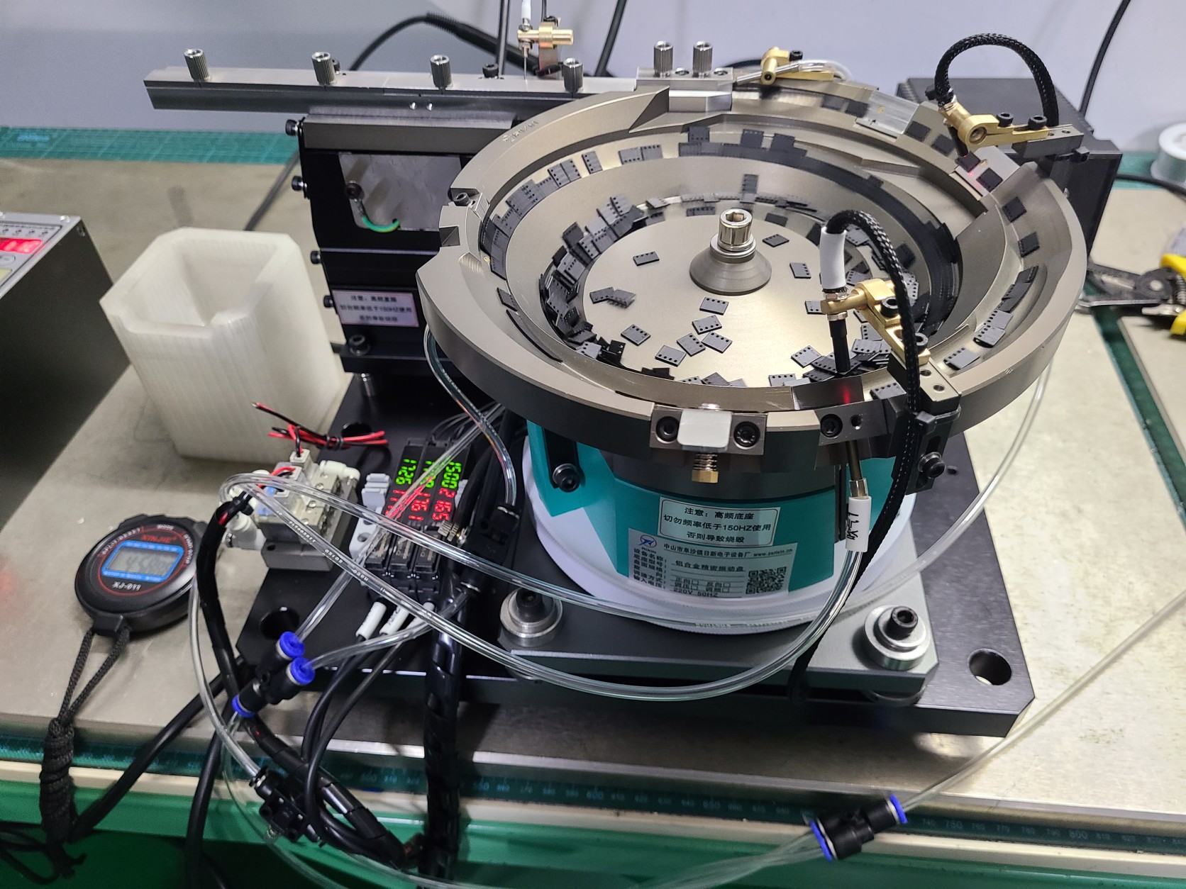 The vibratory feeder arranges randomly oriented parts (such as screws, electronic components, etc.) in a specified direction and sequence through vibration and track-based sorting. These parts are delivered to the outlet (feeding position), ensuring the robotic arm can stably pick the target item.