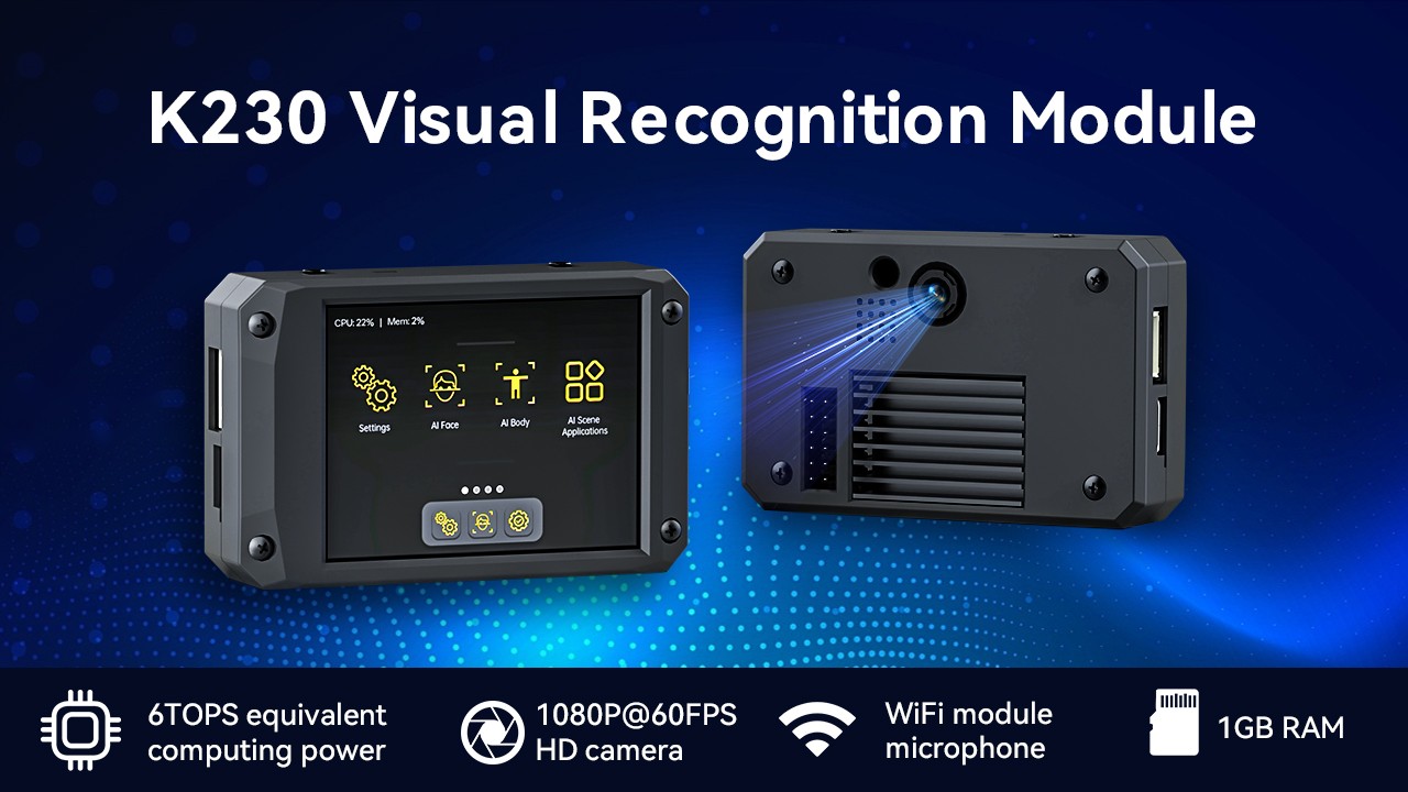 The K230 vision module is compact and exquisite, compatible with a variety of mounting brackets, and can be flexibly integrated into various AI vision application systems to achieve functions such as autonomous driving, road sign recognition and turning, license plate recognition and tracking, and face recognition and tracking.