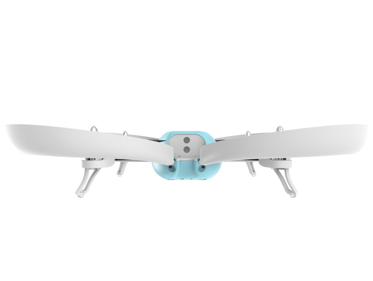 I was surprised at how young some of the kids were who wanted to get in there with Spiri, and at how quickly they became comfortable with guiding it around. We’ve had some memorable misadventures as well. I was at a giant conference this past winter, where Spiri was being featured. But once we got there, suddenly nothing seemed to work. An entertainment industry person had come to see Spiri in action and just as she was arriving at our station, one of the new experimental batteries we were testing caught on fire! This was a fireball that lasted over a minute, attracting a baffled crowd until one of the conference organizers threw a plate on it (the food had just arrived). For the rest of the conference they gave us our very own security guard with a fire extinguisher ready. Don’t worry, though. Since then we’ve built a battery safety circuit that is unparalleled in quadcopters. Trial and error, trial and error... Our design has come a long way in these two and a half years. Here’s the front view.