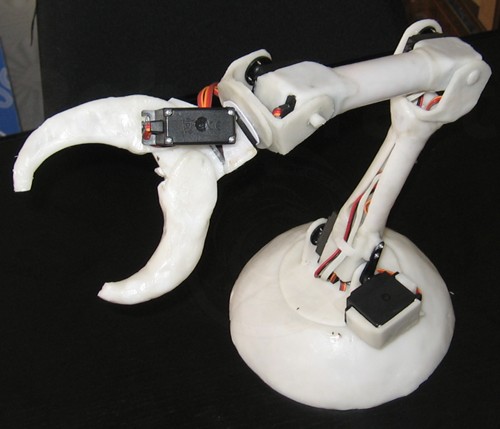 Alexey from robocraft.ru (site in Russian) made his entire robotic arm complete with claw out of Polymorph (a.k.a Shapelock), a low-melting-temperature plastic that can be moulded and manipulated with bare hands. His craftsmanship is remarkable and as shown in his picture log (you will need to use Google translate if you don't speak Russian), he used many ingenious ways in order to shape the various parts of the arm.
