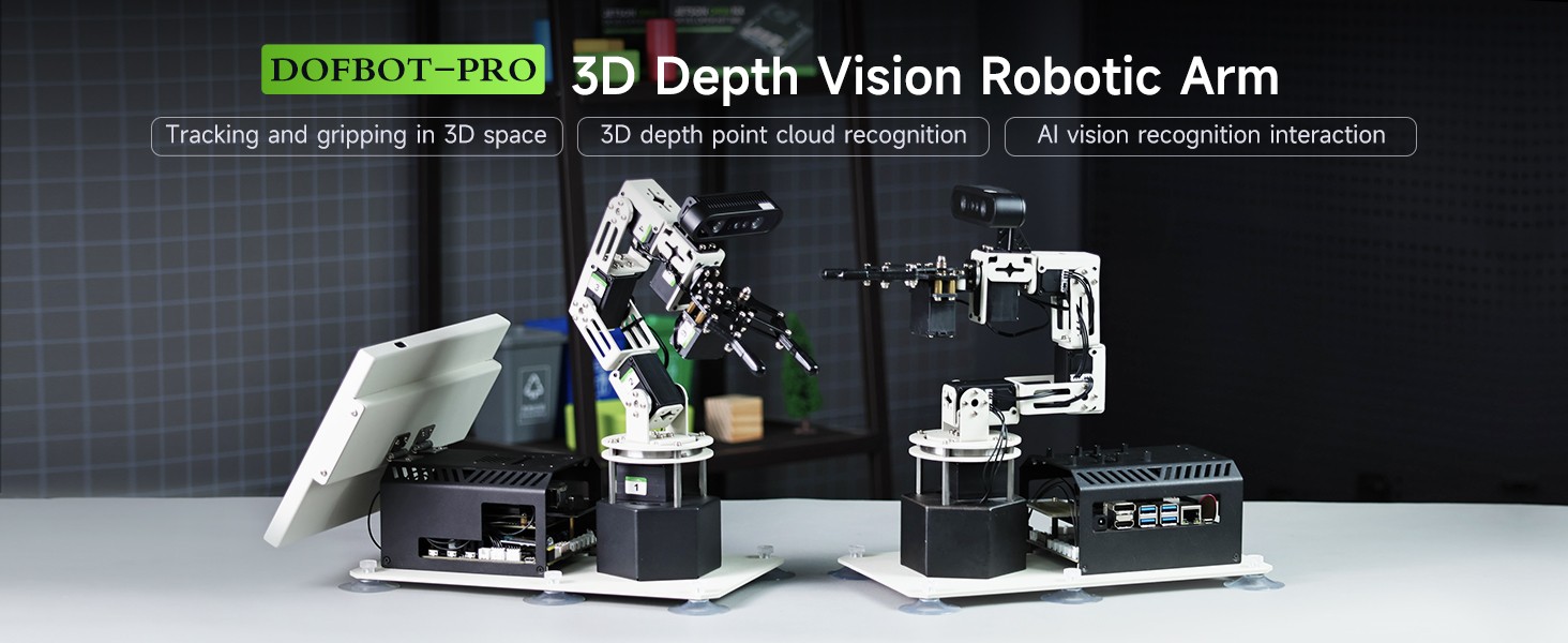 The end is equipped with a high-performance binocular structured light depth camera, which enables DOFBOT-PRO to calculate the distance, shape, height, volume and other information of the object in 3D space based on the RGB data, position coordinates and depth information of the target object, thereby improving the autonomy and intelligence of the robotic arm to achieve more AI projects.