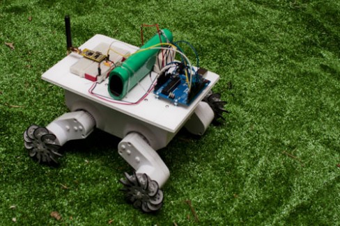 I took the 48-wheeled Rover 5 along to MAKLab (which, if you recall, is where I printed the wheels) to show him off but discovered after driving it for a while that three small wheels on one hub were missing (later found in the boot (trunk) of my car). The lack of three little wheels didn't stop him performing for everyone even with a slight limp. The wheels are now glued back in place and I'll know not to put the robot too close to fixtures in the boot of the car (especially with the speed bumps and potholes I have to negotiate).