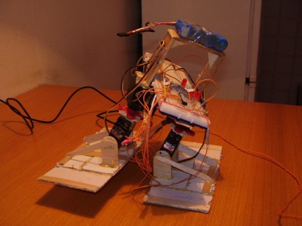 This is a very simple robot using only Picaxe-08M. I can be controlled throught computer or it can walk alone. The bateries are only weight for ballance, just to make it stand on one foot.