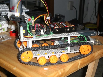 First step into robotics with Fristsl PICAXE bot. Basic chassis complete (tamiya track & wheel set/universal plates/dual motor gear box, Sharp IR, PICAxe28X1, a servo).
