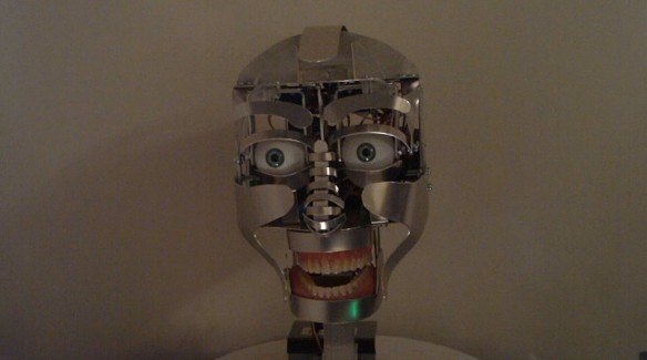 He is made from scrap from my garage, mainly .9mm and 1.2mm aluminium sheet, with support brackets using 2mm aluminium. All cut manually using hacksaw and dremel. The cheek bones were challenging to get shape and angles right. Teeth were donated by a neighbour when he got a new set! Eyes are table tennis balls.