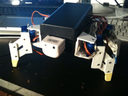 As for the programming part goes, I wrote some classes so I can reuse stuff easily. So for example I have a Hip and Knee classes (I will extract them to Joint class, because they're basically the same, only the naming is different (eg. knee.up() vs. hip.forth()), which together make a Leg object. Four legs then form a Quadruped class that has functions like forward(), backwards() etc., so you can have very simple loop function like { if (speed > 0) quad.forward(speed); }) I'm not sure how I will implement smooth transitioning between gaits, e.g. I want to have a trotting gait (I think it's called that way) for forward/back motion let's say, but have wave gait (crawl/creeping) for turning maybe... They have different leg timings and positions and when controlled with a nunchuk you have to be able to convert from one to another at any point in time. Definitely I will have to rewrite some code to make it better (it's very buggy and crude), because at the moment I have nothing that would recalibrate legs at specific points (if this is even the way it's done??) in time or position so they eventually go out of optimal timing, even more so if I change directions of walking and walk very fast). If anyone has experience in programming walking gaits and has any valuable knowledge to share on how to go about programming such thing, I would be very grateful!