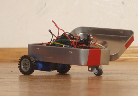 The little fellow itself is made from a little metal box (originally made for containing plastic cards), a picaxe 28x1 project board and an xBee connected to it.