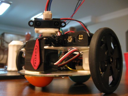 Hi this is my first robot based on the Start Here Bot.  Thank you for all of your help I hope you enjoyed  my first robot. Here's more pictures: The brain: Shiny: The code (bask in it's glory): symbol dangerlevelmin = 18 ' how far away should thing be, before we react? symbol dangerlevelmax = 85 ' how far away should thing be, before we react? note (150 is closer than 110) symbol turn = 300 ' this sets how much should be turned symbol servo_turn = 225 ' This sets ...