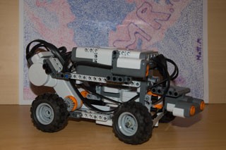 Chaser - its provisional name - is another design from David Perdue. There's Ackerman steering at the front, and the rear wheels are independently driven by a motor each. This design, constrained by the parts in the current nxt kit, has the ultrasonic detector attached to the steering motor, so to turn the sensor it has to turn the wheels. This compromise is brought about by the lack of a differential for the back wheels. One of my first mods will be to install a rear diff, free up a motor and use it to separate ultrasonic detector movement from steering movement. I guess I'm also going to have to attempt the three-point turn manoeuver.