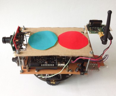 This was a project I did some time ago as an assignment at my university, my team called him Crusher but he was actually a very peaceful robot. It consisted of a mobile robot that used two DC motors connected to two side wheels to move and a rear ball wheel as support. It used a microcontroller to process the data acquired by the onboard sensors, these were a front camera to detect objects and their color, an infrared sensor to determine the distance to objects in the field and a Bluetooth module for wireless communication with a PC. The PC used the information from a private web server that listed the position of the colored balls using a Python script which used the information acquired by the aerial camera and corrected the perspective using an AR marker to give the coordinates, size, and color of the balls, this allowed the robot to know the location and color of the targets present on the field.