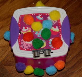 Fluffy is my first robot. Why pink you may ask? Well I was looking in the 99c store for a box which would fit my chassis and this pink box was the only thing they had. My wife was with me so she convinced me to go all the way and make it a nice fluffy robot. It's still a WIP but when it is finished I will finish it off with some fluffy balls so that's how I came up with the name...