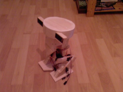this is my funny walker made out of balsa, it tracks objects with two sonic sensors and has two settings, with one setting it will just sit and track with its head and the other it will walk towards and turn towards odjects and back up if it gets to close. unfortunately the robot does not move as quick as i would like without falling over and the lipoly voltage monitor is unreliable.