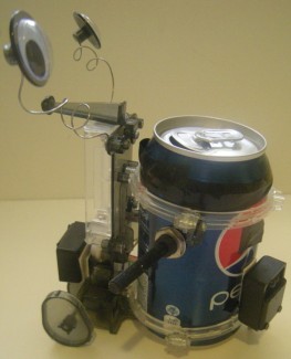 The robot is driven by a single geared DC motor and holds a 12-oz soda can. Due to the egg-shaped wheels, its movement resembles a drunken sailor. Its original one AA battery was replaced by a battery-pack of four AA batteries, partially depleted from other toys, to get 4.5 – 5.5 V input voltage. The battery-pack was inserted inside the cut soda can with a PCB. The PCB (universal, line, e=0.1´´) contains a bidirectional motor driver L293D, three 555 ICs for adjusting the sensors and motor speed control and 74HC74 flip-flop IC for motor direction changes.