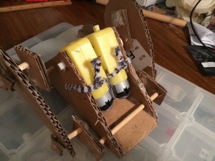 To do that, I used a pipe cleaner with hot glue to attach one motor shaft to the inner pole, and used a small, hot-glued wooden spool (yes, you read that correctly) to connect the shaft and pole on the outer side. I also used more pipe cleaner to attach the motor to the chassis.