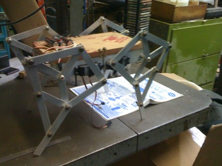 My robot differs from Jansen's designs in that each leg has it's own pivot. This was to help experement, although on the final small design, i will use only two drives for all four legs.