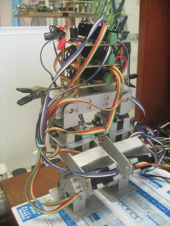 This bipedal is made with 12 low cost servos (MG995), 4 atmega168, aluminium material for window frames, and with small hand drills, hand saws and files.