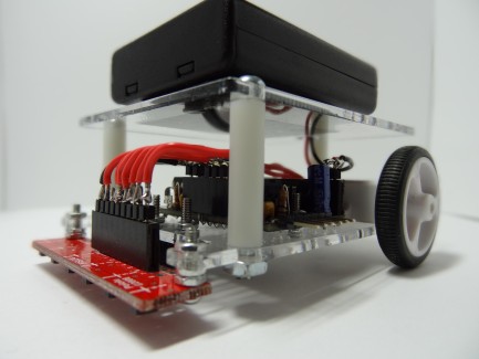 The electronics part of it consists of a RBBB Arduino, My own L293D breakout board, and an array of reflectance sensors (not seen below)