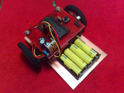 - Power source: 4 AA batteries for motors + 9V battery and 7805 for electronics