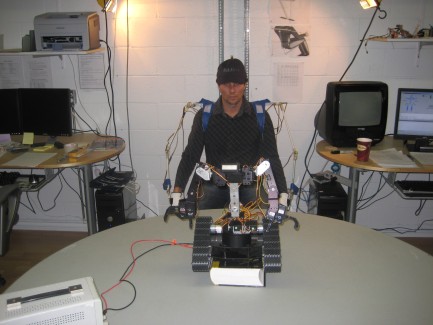 We did a lot of experimentation and in the end, the Lynxmotion Johnny 5 robotic platform was used, and a motion-capture exoskeleton was put together using mainly potentiometers and wooden sticks. Incredibly cheap but worked well.