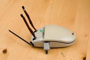 Found that I had no less than eight old mice around the house. Chose a Logitech one to rip apart. There's a little board inside dated 1988, so the mouse is 20 years old. I didn't realise they had been around as longs as that. There's a IC on the board with an ID of 42C40P1924. Having seen today's thread on commercial use of PICs I thought I'd look this up. There's a few for sale on the web, but no spec sheet so I've no idea what it is yet. Mounting the on/off swicth should be simple as this old mouse has two screw posts side by side. But, the front edge below the buttons is very low, and I'm not sure how I'll fit the whisker.
