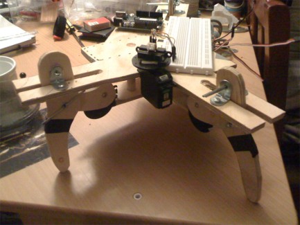 so this is my first robot it has (4 servos)  3 for three legs  and 1 servo that will rotate the ir range finder a arduino for the brain. it is no ware near done yet the chassy is almost there now it is time to learn the electronic side of it :)