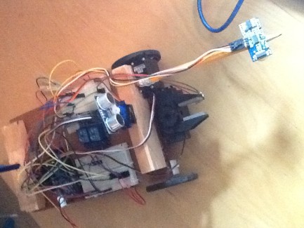 This is a robot that can be controlled by a wii nunchuck, or it can navigate on its own. It avoids cliffs with the ultrasonic sensor on the front arm, and it avoids obstances with the front-facing ultrasonic sensor. It has a grabbing device on the front which is powered by a servo. It can go backwards (only with one wheel) using the relay ( I only had one pair of relays). It has a pen for a back wheel, which slides along the ground with relatively low friction. It can be controlled by a wii nunchuk. I got the code to connect the wii nunchuck and arduino from: http://todbot.com/blog/.