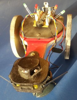 I made this mostly wooden bot in 2006. I used a couple of small scrap motors. Maybe I had them from tape recorders. As I had no experience I started without gearing. That made some marks at the baseboards. I added some gears, but it was never very successful.